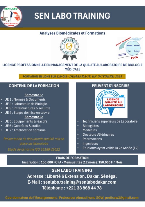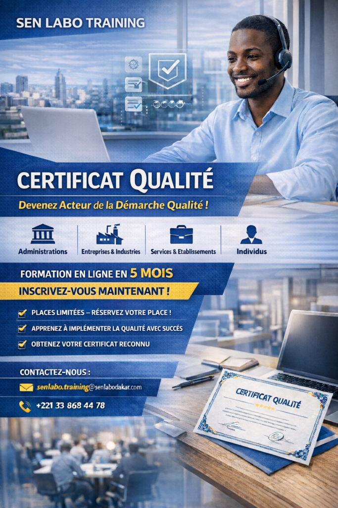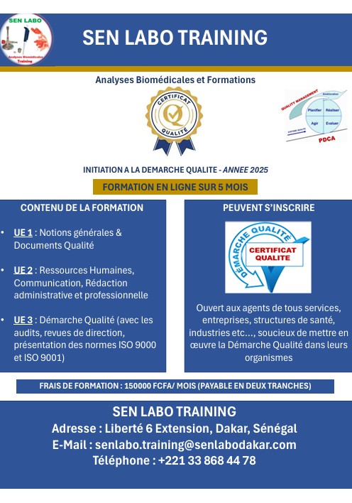 Sen Labo Training est un département de SenLabo chargé de la formation des ressources humaines. Il s’agit de formations à distance (en Ligne) orientées vers la démarche qualité avec :